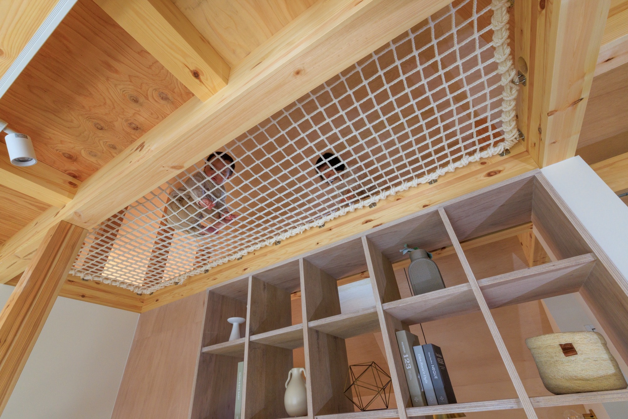 まずご紹介したいのは、ロフトにネットを張ったユニークな空間づくり。奥様が設計されたこのお家では、はしごで上がったロフトに、ハンモックのようなネットが設けられています。お子さまたちが飛び跳ねたり、寝転んだり、大人も一緒にくつろげる、まるで“家の中の公園”のような場所。吹き抜けのある空間に張られたネットからは、家全体を見渡せる開放感もあり、親子のコミュニケーションも自然と生まれます。
