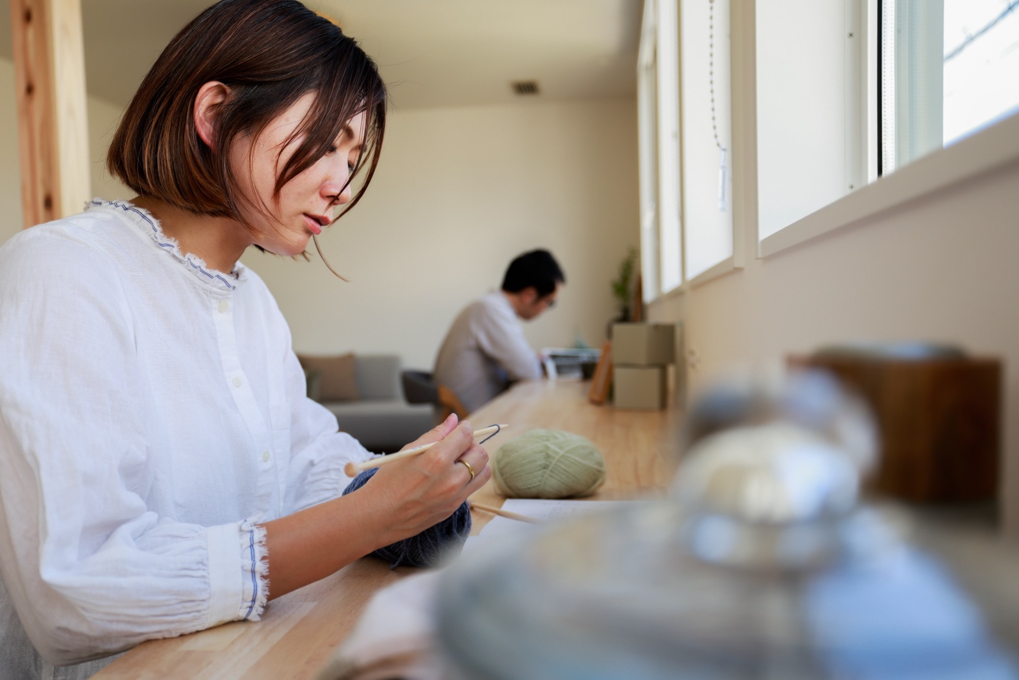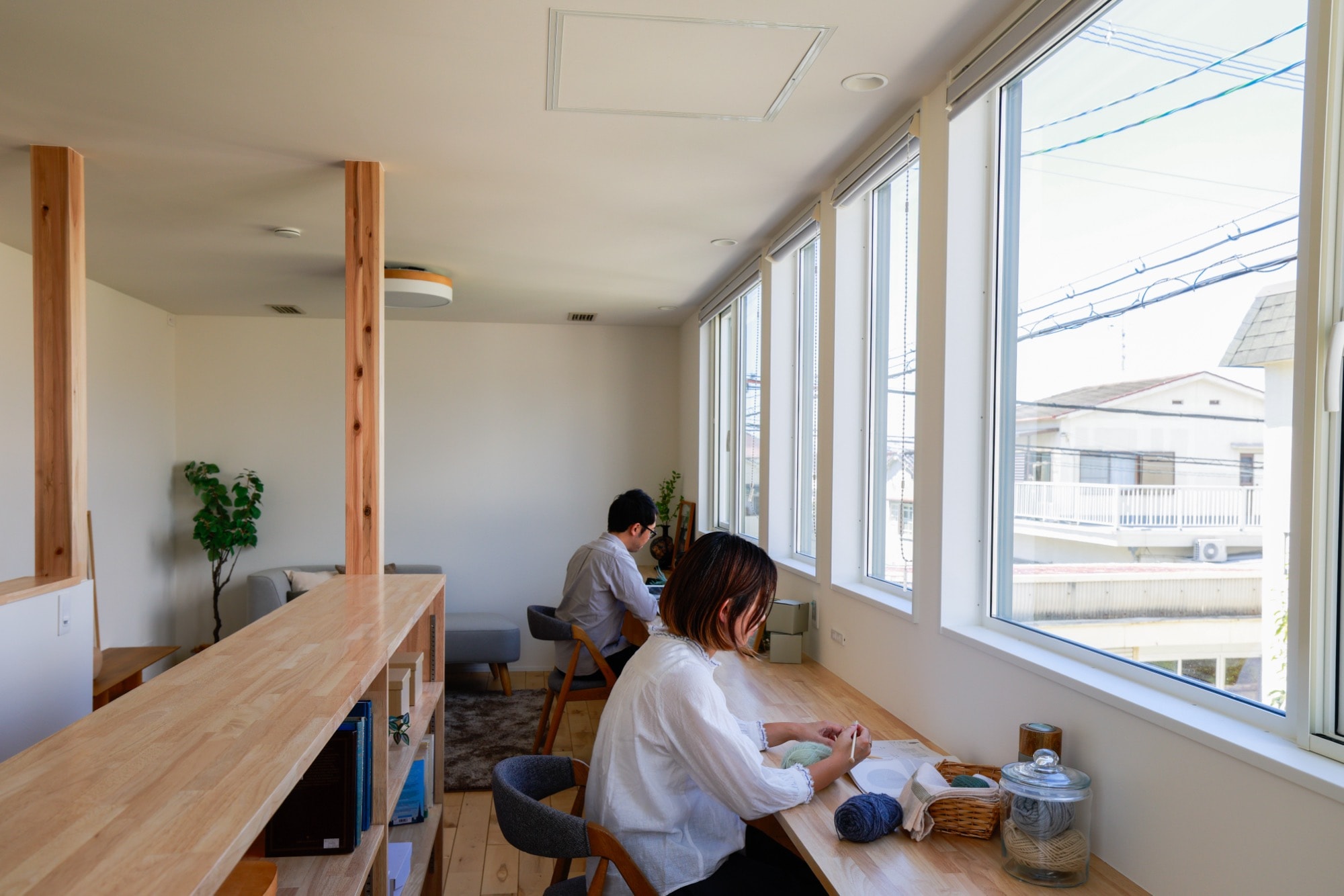 続いては、読書好きのご夫婦が建築家と一緒につくり上げた家の、 “窓辺の図書スペース”。6mを超える長さの造作カウンターが北向きの大きな窓に沿って設置され、やわらかな自然光のもとで本を読んだり、PC作業をしたりと、まるで図書館のような落ち着いた雰囲気。窓を北側に設けたことで直射日光が入らず、長時間いても疲れにくい空間となっています。