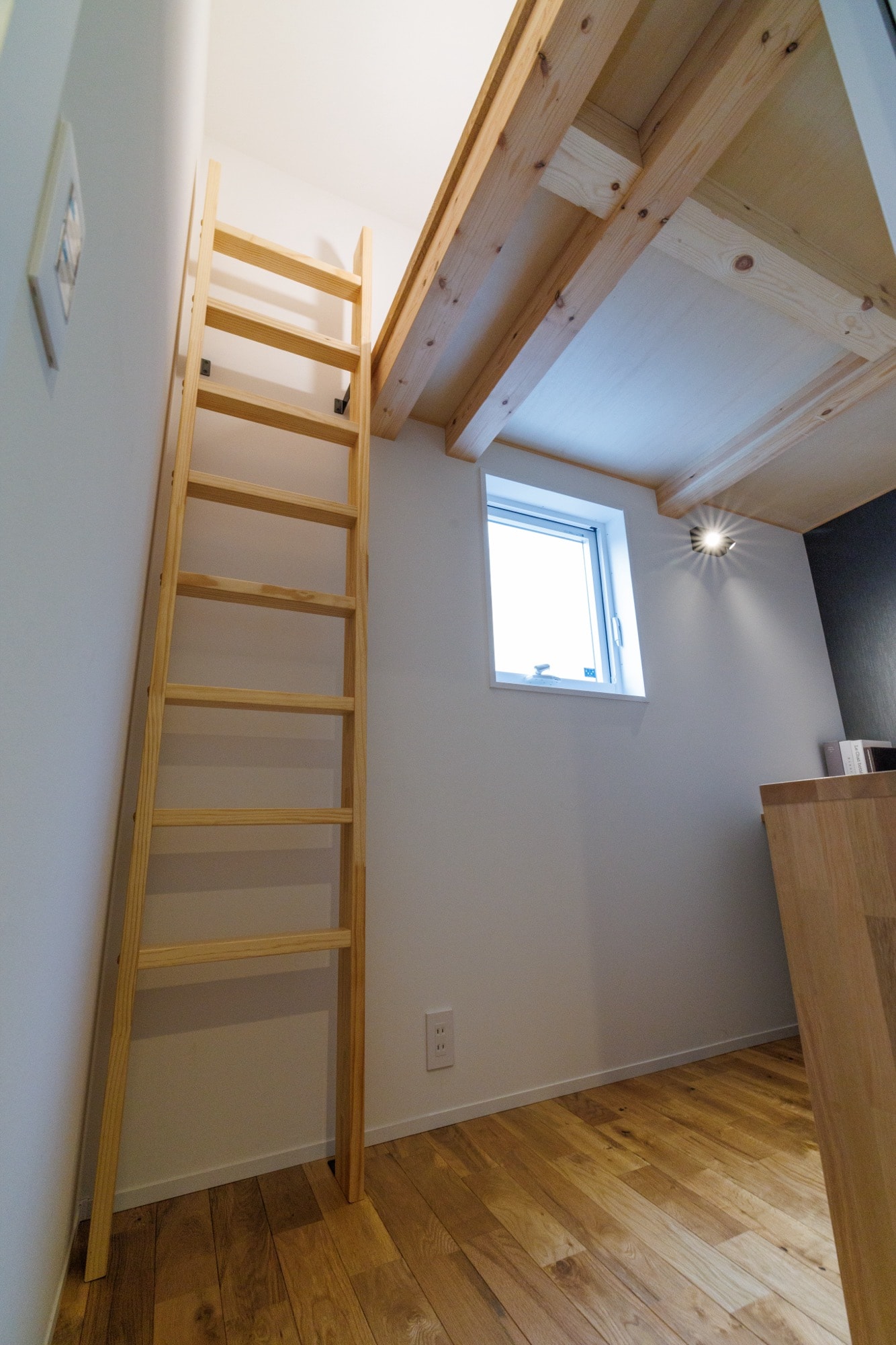次に印象的だったのは、ご主人専用ロフト付きワークスペース。まるで秘密基地のような空間に設けられた書斎は、集中したいときにぴったり。ロフトは大人一人がちょうど寝ころがれるサイズで、仮眠をとることも可能。収納スペースとしても使えるため、省スペースながら機能性も◎。ご家族のライフスタイルに合わせて、ただの「部屋」ではない“居場所”をつくる発想が素敵でした。